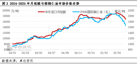 6月以来,在原料棕榈仁油市场连续宽幅的下跌走势中,月桂酸外盘低价增多,市场听闻1850-1900美元/吨外盘商谈价格,国内部分进口商加速出货意愿增强。截至6月11日,市场跌至16500-17000元/吨,较6月初下跌1000元/吨,跌幅5.97%。但与此同时,国内现货供应并不宽松,进口商面对外盘接盘意愿谨慎,且近期到港货源成本偏高,价格下跌也加重下游观望心态,所以市场实则处于“供需双弱、无量空跌”的局面。