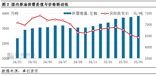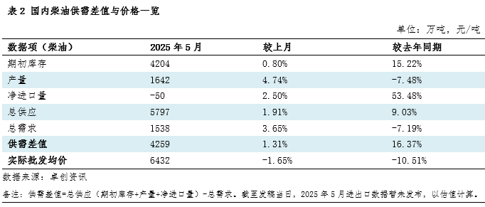 对比去年同期数据,2025年5月柴油供需差值同比增长16.37%,实际批发均价同比下降10.51%。柴油供需差值与批发价格在趋势上呈现反向联动规律,但供需失衡的局面与柴油价格变化幅度存在差距。