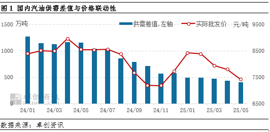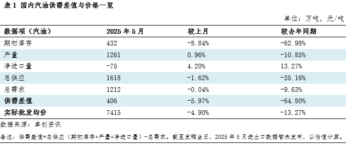5月份汽油总需求量下滑,消费不及预期。2025年5月,国内汽油总需求量1211.88万吨,环比减少0.04%,同比减少9.63%。5月份国内汽油终端消费整体表现平淡,并未出现预期中的改善。具体来看:月初“五一”小长假带来的汽油需求增长预期已提前被市场消化,且假期结束后并未出现显著的补库行为;月末端午节小长假虽带动出行需求小幅回升,但增幅有限。叠加此时尚处传统夏季消费小高峰的初期,5月汽油总需求量环比4月仍呈下滑态势,整体消费形势难言乐观。与此同时,国内汽油市场氛围受价格波动影响明显,5月份国家发改委下调了一次汽油最高零售限价。此次调价加剧了市场的观望情绪,下游采购趋于谨慎,进一步抑制了批发环节的活跃度。