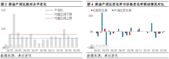 2025年5月,国内柴油产消比为107:100,较上期上涨1个单位,处于均值区间内。这表明,在不考虑中间贸易环节的情况下,柴油生产与消费表现为供求平衡的局面,供需端双增,柴油供求环境显现乐观。从图4来看,本期价格变化率与产消比变化率反向联动,较上期价格变化率缩小,对产消比形成支撑,5月份柴油产消比由此前负增长转为正增长。