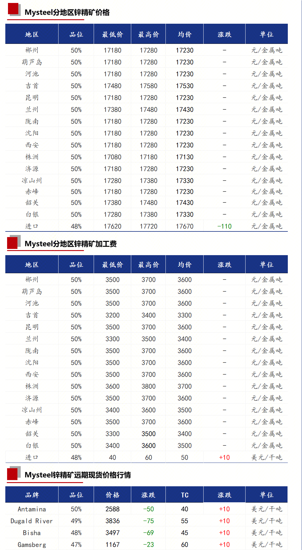 华北地区:内蒙古某锌矿生产企业50品位的锌精矿加工费3600元/金属吨出厂。