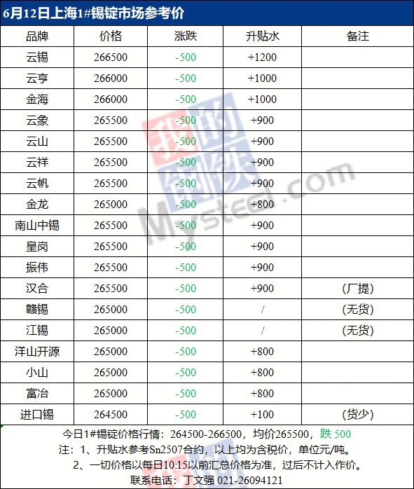 6月12日Mysteel上海现货锡锭报价264500-266500元/吨,均价265500元/吨,较上一交易日跌500元/吨。Mysteel15:30上海现货锡锭成交价格264500-266500元/吨,均价265500元/吨,较上一交易日持平。