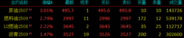 近期,受中东局势升级影响,油价大幅拉升。截至6月12日收盘,原油涨幅为3.01%,领涨国内期市。高硫燃料油、低硫燃料油、沥青跟随原油上涨,涨幅分别为2.74%、2.22%、1.47%。