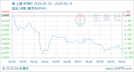 6月13日,生意社镍基准价为122066.67元/吨,与本月初(122425.00元/吨)相比,下降了0.29%。