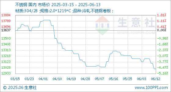 6月13日,生意社不锈钢基准价为13012.50元/吨,与本月初(13175.00元/吨)相比,下降了1.23%。