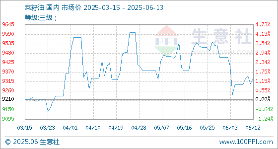 6月13日生意社菜籽油基准价为9333.33元/吨
