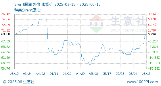 6月13日生意社Brent原油基准价为69.77美元/桶