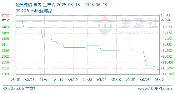 6月13日,生意社轻质纯碱基准价为1310.00元/吨,与本月初(1386.00元/吨)相比,下降了5.48%。