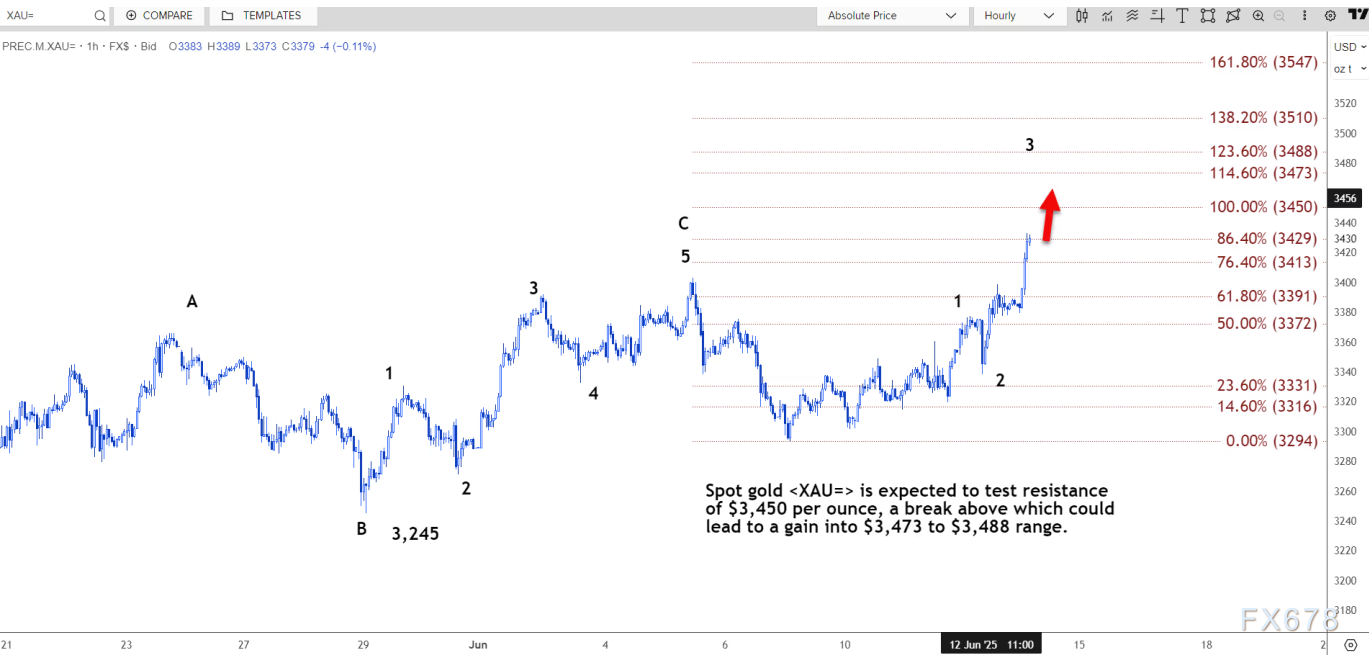 路透技术分析师指出,现货黄金预计将测试每盎司 3450 美元的阻力位,突破该阻力位则可能上涨至 3473 美元至 3488 美元的区间。