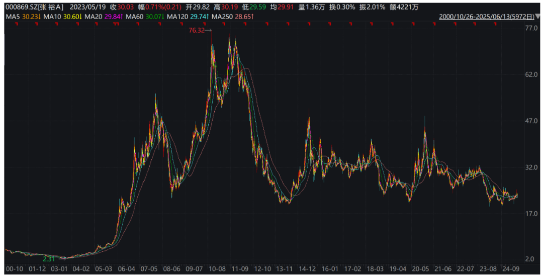 业绩承压,张裕A近年来股价也算不上理想。2021年至2024年,公司股价连年下跌,2025年至今又跌去近3%,四年多时间市值缩水约235亿元。截至而6月12日,公司最新收盘价仅剩22.11元/股。更严峻的是,6月3日,深交所公布深证成指、创业板指等核心指数样本股调整名单,张裕被调出深证成份指数样本股,这也在一定程度上说明资本市场对张裕未来发展前景持怀疑态度。