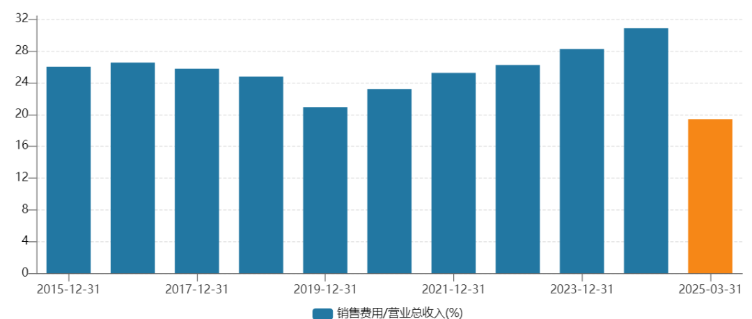 不过,投资时间网、标点财经研究员注意到,事实上,张裕用于销售的费用占比其实并不低,2024年,公司销售费用为10.13亿元,虽同比下降18.29%,但销售费用率增至30.91%,达到近十年高点。换言之,张裕售卖一个产品收入100元,就会有大概30元投入到销售中。或许正如孙健所言,“公司拿不出更多钱来做营销,哪怕拿出有限的钱,也没能呈现出更高的‘花’的水平,这样就不是良性循环”。