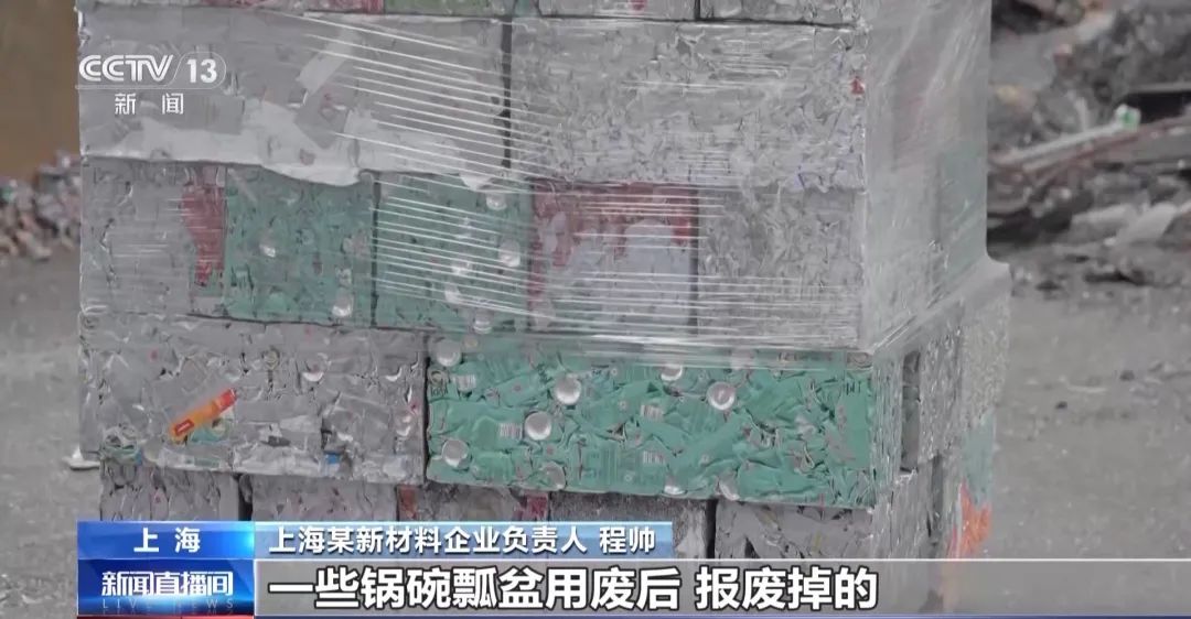 上海某新材料企业负责人程帅:这些废铝来源包括,汽车到了报废年限拆解出来的废铝,生活中使用过的易拉罐,或者一些锅碗瓢盆用废后报废掉的。