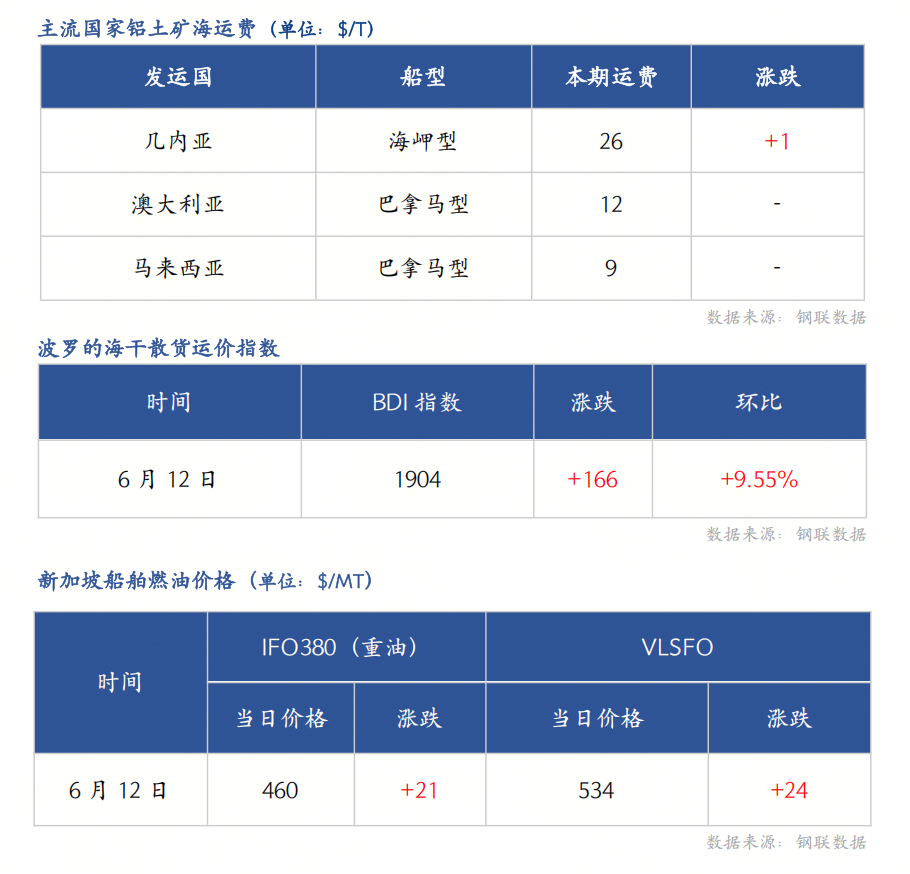 6月13日国内外主流矿石价格持稳,主流地区海运费和波罗的海运价指数以及新加坡船舶燃油价格均有上涨。