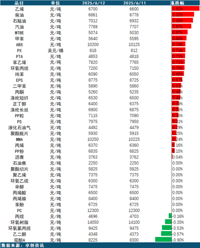 截至6月12日收盘,卓创资讯所跟踪的40个主要石油化工品中,65%的产品出现上涨,涨幅前三的产品分别是乙烯(1.52%)、柴油(1.22%)、石脑油(1.15%);9个产品持平,占比23%;另有12.5%的化工品下跌,跌幅前三的产品分别是双酚A(-0.9%)、乙二醇(-0.57%)、环氧氯丙烷(-0.53%)。原油上涨对部分化工品有所带动,但多数业者对需求前景担忧,下游用户买涨气氛偏弱。