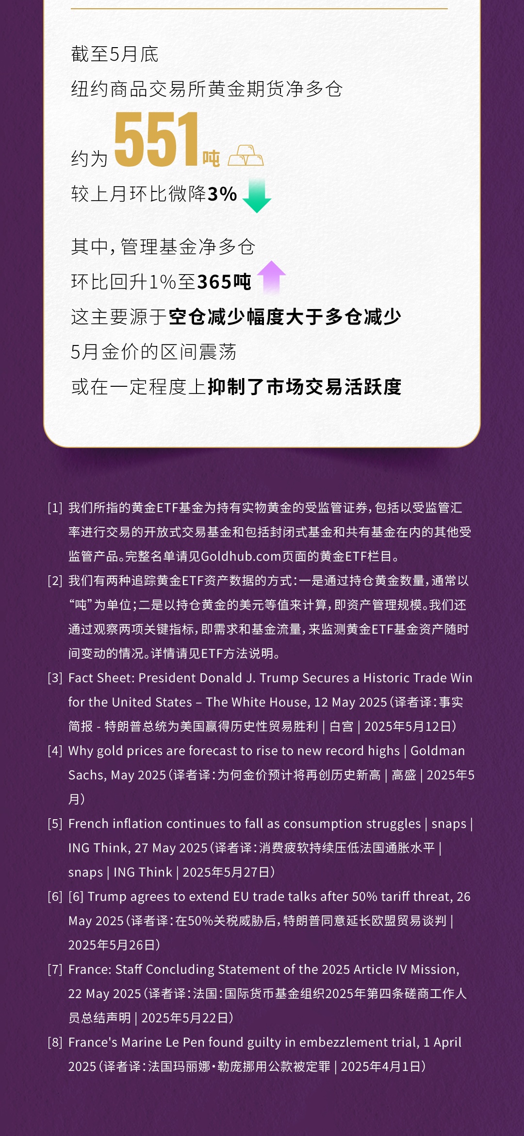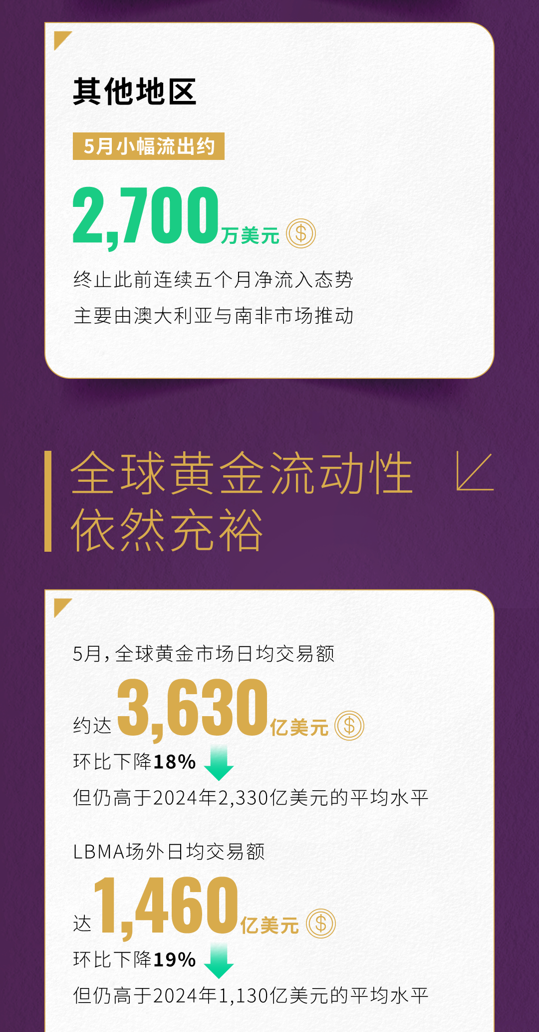 全球黄金流动性依然充裕。5月,全球黄金市场日均交易额约达3,630亿美元,环比下降18%。但仍高于2024年2,330亿美元的平均水平。LBMA场外日均交易额达1,460亿美元,环比下降19%但仍高于2024年1,130亿美元的平均水平。