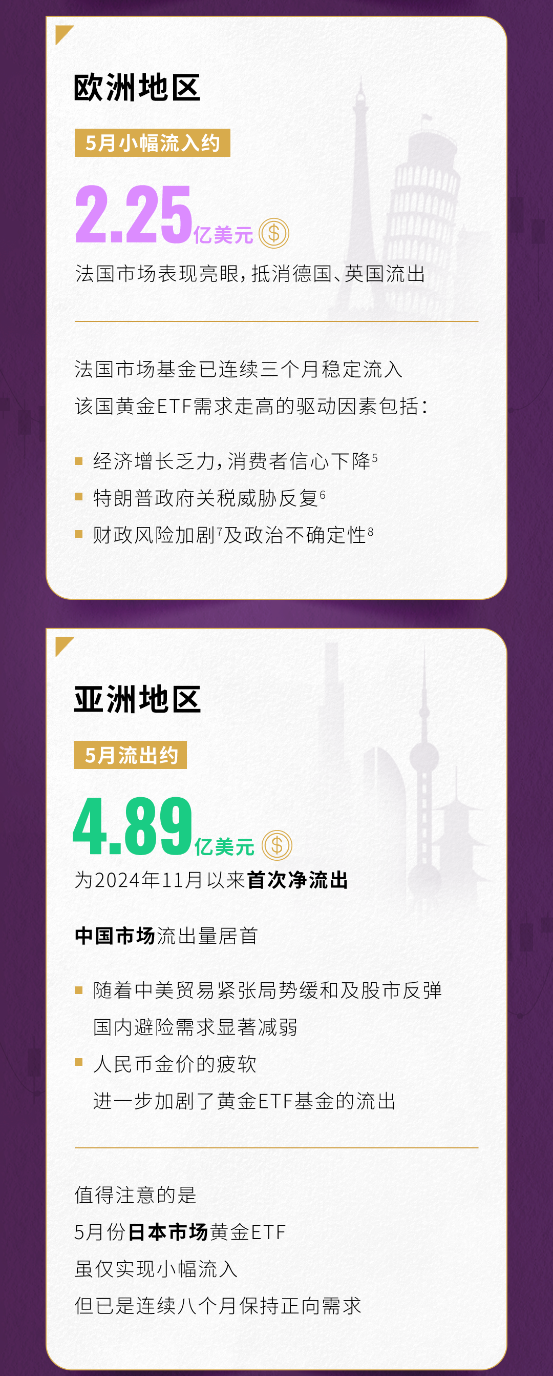 世界黄金协会称,5月,全球黄金ETF流动势能放缓,全球实物黄金ETF流出约18亿美元,终止了连续五个月的净流入态势,这是自2024年11月以来全球黄金ETF首次月度净流出。受金价小幅回落的影响,全球黄金ETF资产管理总规模5月末降至3,740亿美元。