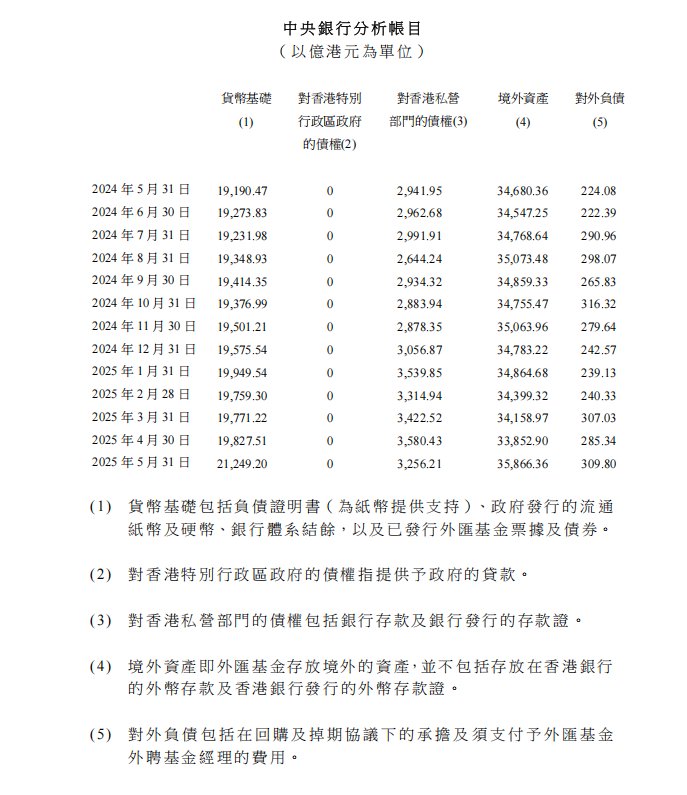 6月13日,香港金融管理局公布外汇基金在2025年5月底的主要分析账目。在5月份,外汇基金的境外资产增加2013亿港元,至35866亿港元。货币基础为21249亿港元,包括负债证明书、政府发行的流通纸币及硬币、银行体系结余,以及已发行外汇基金票据及债券。外汇基金对香港私营部门的债权总额为3256亿港元。对外负债总额为310亿港元。