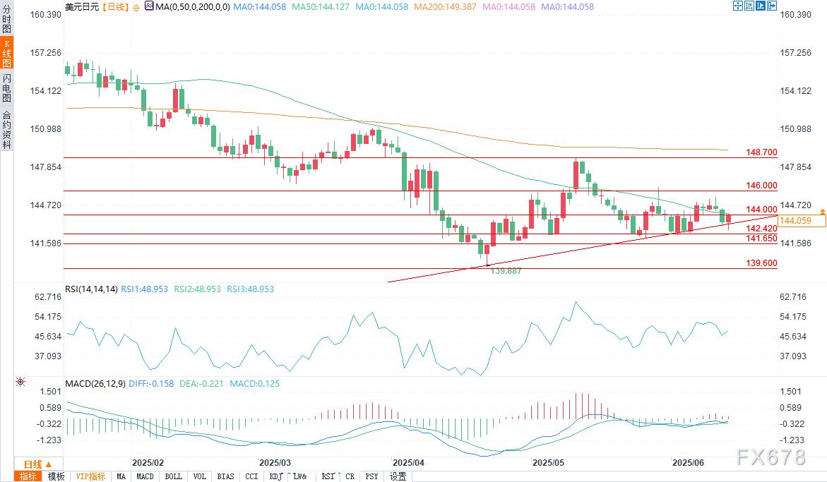 周五(6月13日)欧盘时段,美元/欧元盘中报144.042/51,涨幅0.39%。分时图上短期多头有尝试拉升,多头力量有阶段性发力,但力量暂未完全确立优势。