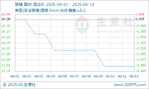 据生意社商品分析系统显示,下游玻璃行情弱势有限。6月6至13日,玻璃价格从14.00元/平方米下调至13.80元/平方米,跌幅1.43%。玻璃下游消耗缓慢,需求持续偏弱,玻璃市场累库明显,企业出货不佳,价格重心弱势下行。