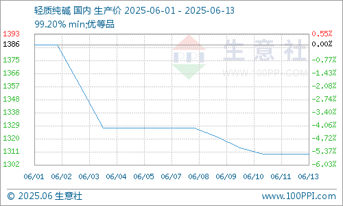 据生意社商品分析系统显示,本周纯碱价格走势持续下调,截至6月13日纯碱市场均价在1310元/吨,与6月6日纯碱价格1328元/吨相比跌幅1.36%,较月初下调5.48%。