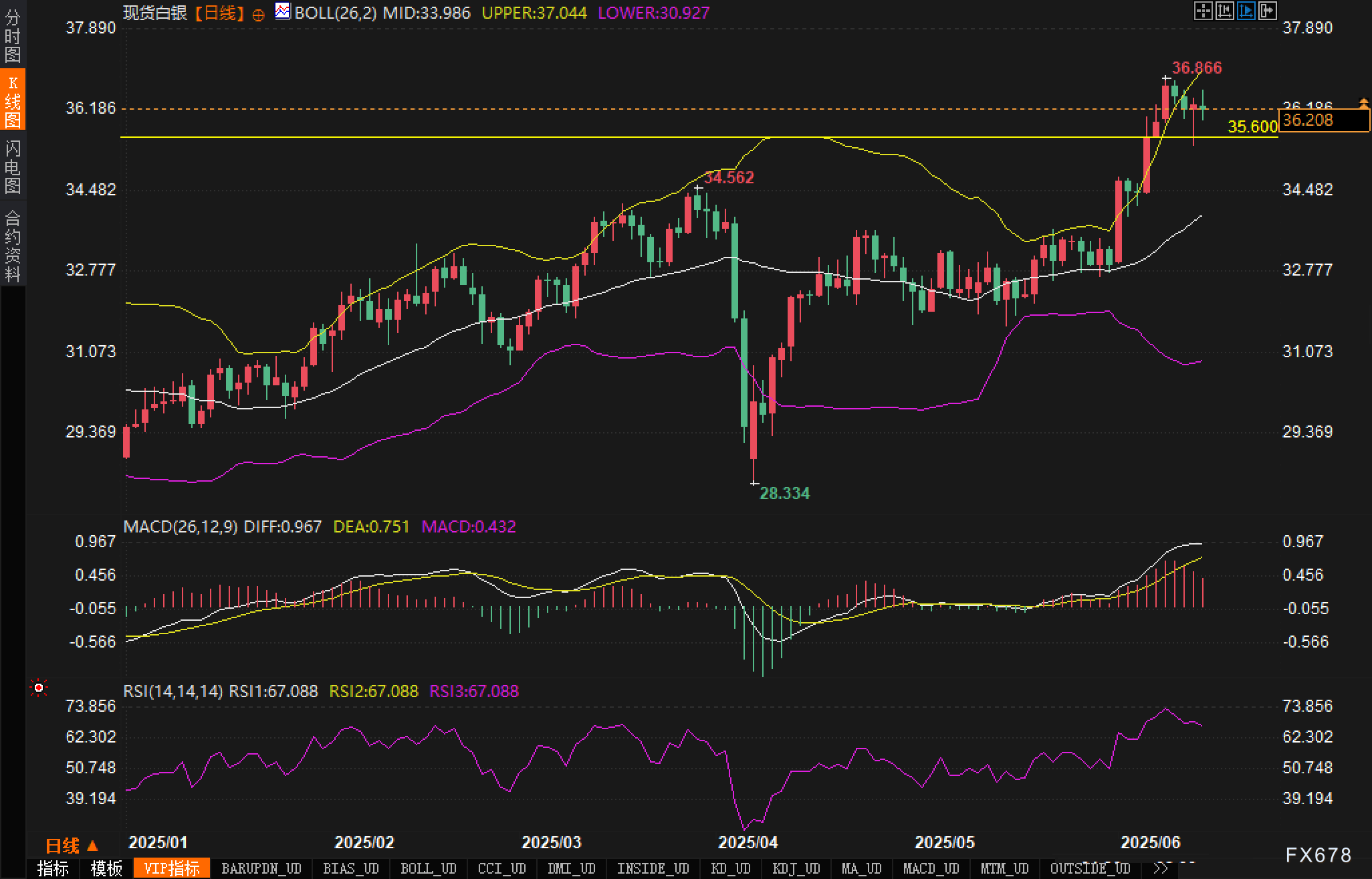 汇通财经APP讯——周五(6月13日),现货白银延续近几日的高位震荡格局,盘中一度回踩36美元下方,随后重新回到36美元上方整理,整体运行维持在本周高位附近横盘。当前银价距离本周创下的阶段高点36.866美元仅一步之遥,市场波动虽有所收敛,但价格重心持续抬升,反映出多头主导下的强势整理节奏。