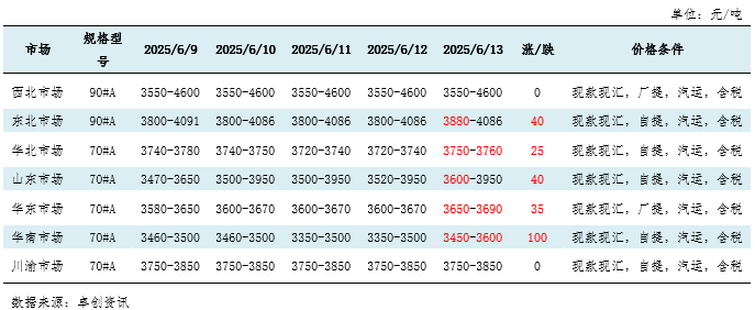 受到原油价格上涨的带动,沥青期现价格双双走高,期货方面,BU2509合约盘中最高涨至3708元/吨,较昨日收盘价上涨181元/吨,虽然涨幅不及原油,但是也创下近3个月来的新高。虽然沿江地区陆续入梅,市场刚需表现偏弱,北方市场需求同样表现欠佳,但是盘面价格大幅走高,基差快速走弱有效的提振了现货市场价格。