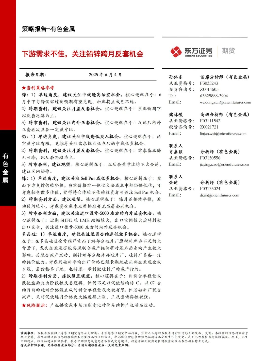 有色金属:下游需求不佳,关注铅锌跨月反套机会