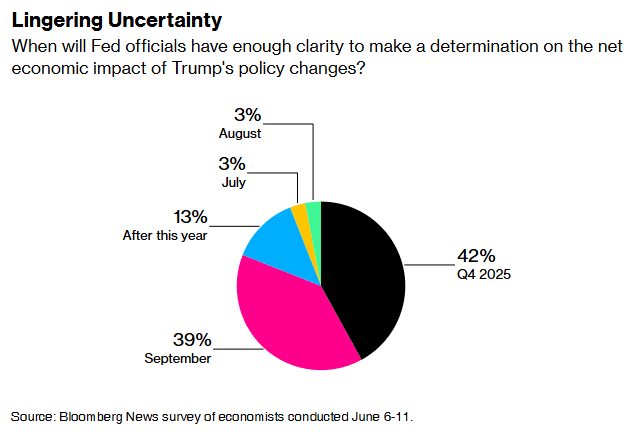这项在6月6日至11日进行的调查显示,超过90%的受访经济学家表示,美联储至少要到九月才可能获得足够的清晰度,以判断特朗普政府贸易、移民和财政支出政策对经济的影响。略多于一半的受访经济学家认为,这种清晰度要等到第四季度,甚至有些人认为要等到今年之后才会显现。