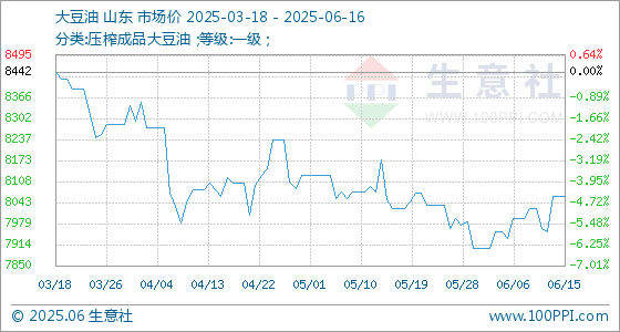 6月16日,生意社大豆油基准价为8064.00元/吨,与本月初(7904.00元/吨)相比,上涨了2.02%。