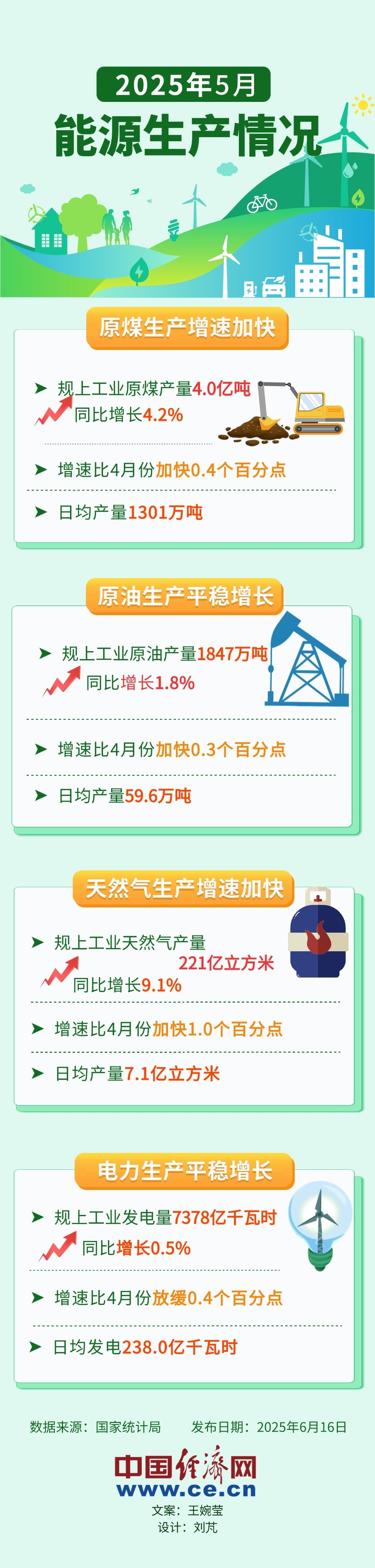 中国经济网北京6月16日讯(记者王婉莹) 国家统计局今日发布2025年5月份能源生产情况。5月份,规模以上工业原煤、原油、天然气生产增速加快,其中,天然气产量221亿立方米,同比增长9.1%。