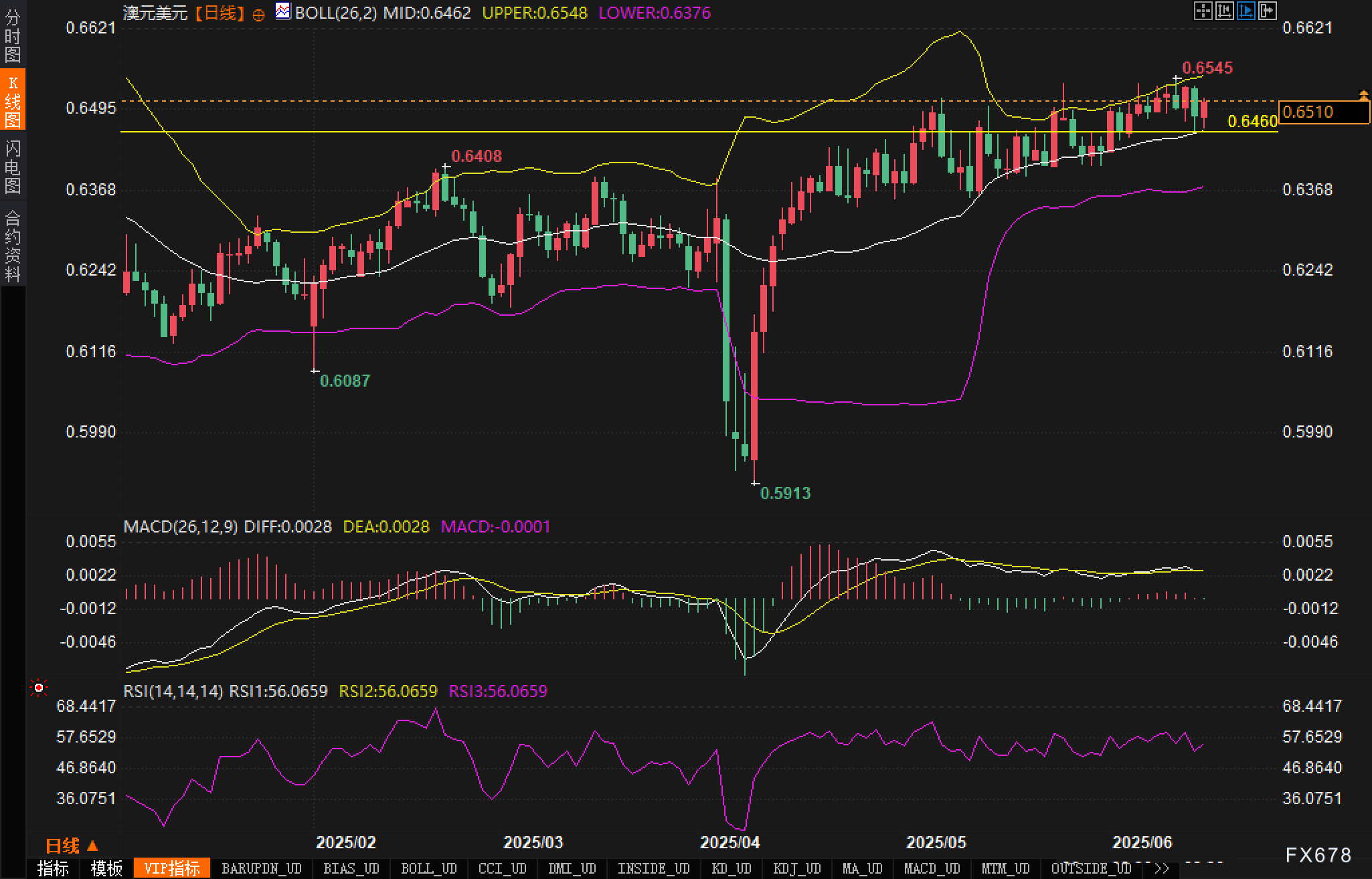 分析认为若澳元兑美元汇价能够守稳0.6460上方,并站稳0.6545阻力位,则有望进一步挑战0.6620区域,维持震荡偏多格局。但若再度受阻并跌破0.6460支撑,则可能开启阶段性回撤,回测布林带中轨或0.6370附近。