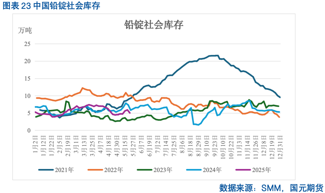LME方面,5月初,美国非农就业数据超预期,市场下调美联储年内降息预期,伦铅震荡下行;随后中美关税政策缓和,美国通胀数据改善,市场情绪回暖,伦铅走势偏强;5月下旬,穆迪下调美国信用评级,叠加美国减税法案在众议院通过,动摇市场信心,伦铅再次震荡下行。