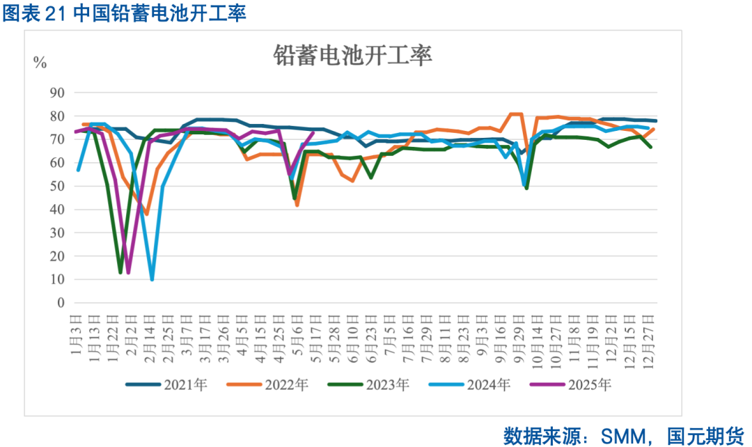 5月原生铅冶炼厂呈增产趋势。本月副产品价格维持高位,原生铅冶炼利润增加刺激下,河南地区前期检修冶炼厂复产,湖南地区冶炼厂提产,原生铅开工率达到近3年绝对高位,5月前三周原生铅产量环比增5.6%,同比增5.94%;平均开工率环比增3.65个百分点,同比增9.73个百分点。
