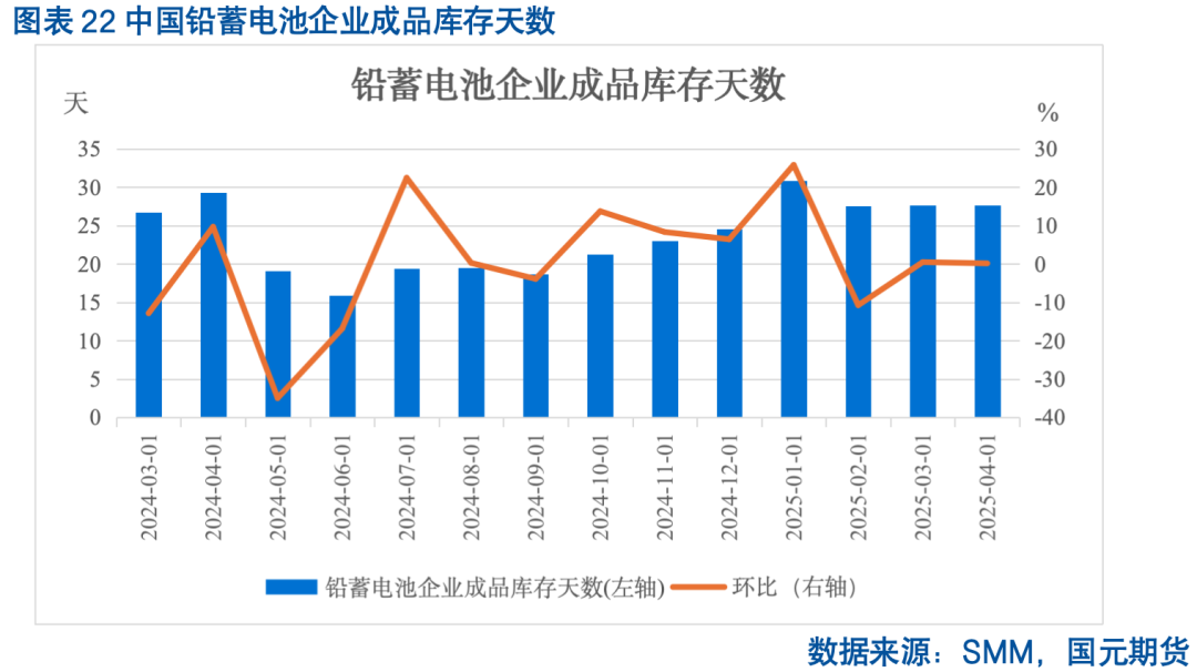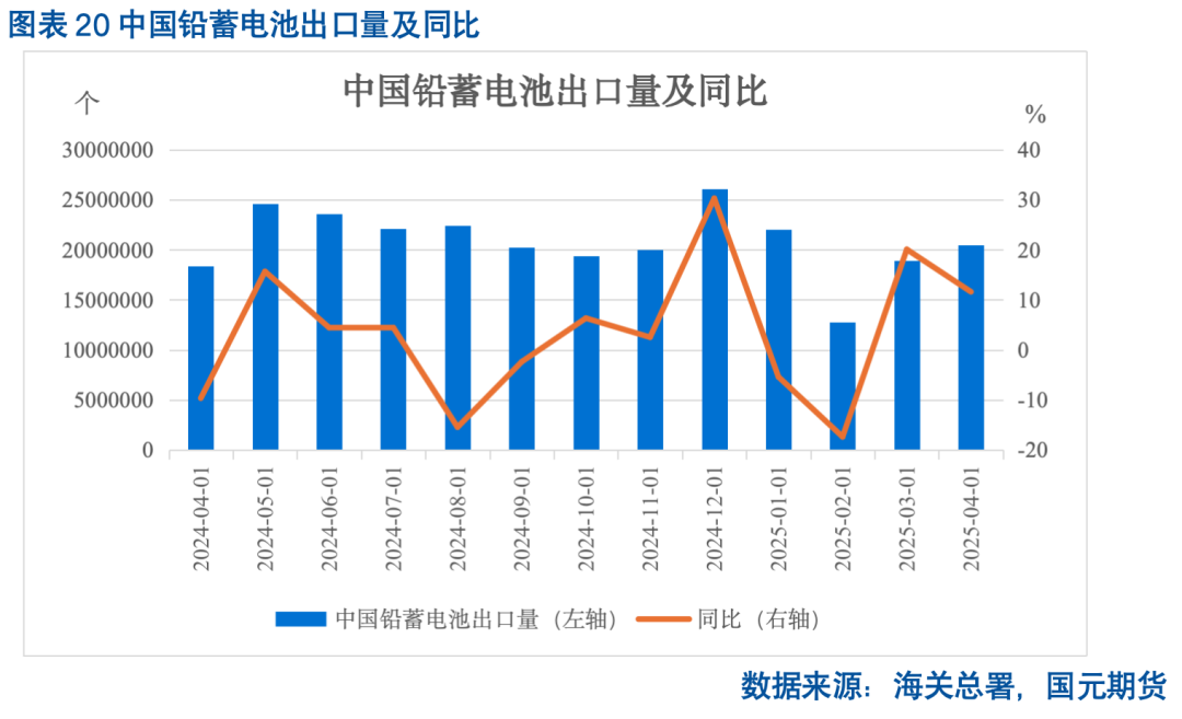 蓄电池方面,按季节性来看,5月为电动自行车蓄电池及汽车蓄电池的替换淡季,叠加劳动节假期的影响,5月前三周铅蓄电池企业平均开工率环比下降3.8个百分点,已显示出淡季需求转弱迹象。从出口来看,在美国关税政策冲击下,抢出口的效应显现,4月铅蓄电池出口量环比增8.3%,同比增11.59%。