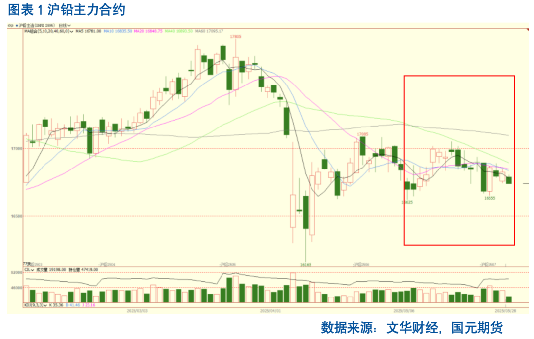 5月沪铅主力合约呈先扬后抑走势。劳动假期期间,下游电池企业放假较多,假期过后冶炼厂铅锭库存累积,压制铅价下行。随后中美贸易政策改善,市场信心恢复,铅价向上修复;但由于国内铅蓄电池市场进入淡季,需求不足致冶炼厂库存进一步累积,叠加废电瓶收购价下调,成本支撑松动,在宏观情绪释放后,铅价恢复震荡偏弱走势。