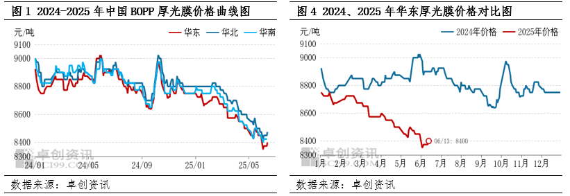 2025年上半年,BOPP价格震荡下行,年内价格虽阶段止跌反弹,但涨幅较小且持续时间不长,多数时间仍处于下跌通道中。截至6月12日,华东厚光膜市场价格在8250-8500元/吨,较年初价格高点跌375元/吨,跌幅在4.29%。较6月初低价仅高25元/吨,此价格处于年内偏低水平。