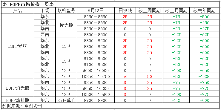 6月为BOPP行业需求淡季,终端货源消化偏缓,BOPP下游用户采购意愿偏弱。但5日起原料期货偏暖震荡,带动现货有所小涨,13日在原油脉冲式上涨带动下,BOPP下游恐涨入市采购增加,市场交投普遍好转,给到市场一定支撑。