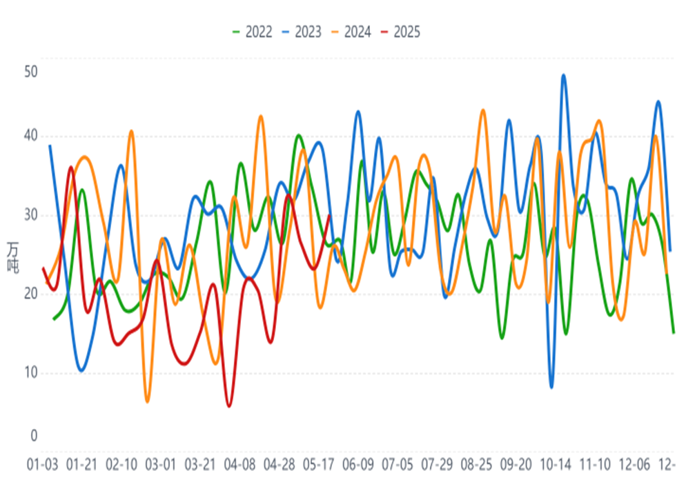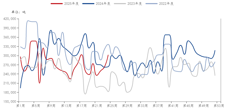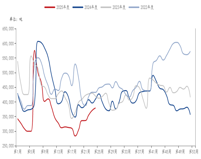 (3)港口库存端:显性外轮卸货明显减量,港口甲醇库存或将转累为去。截至2025年6月11日,周期内中国甲醇样本到港量为46.03万吨;其中,外轮在统计周期内43.73万吨(显性26.53万吨,非显性17.2万吨,其中江苏显性10.33万吨);内贸船周期内补充2.30万吨,其中江苏0.40万吨,广东1.90万吨。本周甲醇进口样本到港计划预估24.73万吨,其中显性15.23万吨,非显性9.5万吨;内贸预估2.5-3万吨附近。
