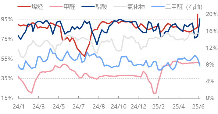 (2)需求端:烯烃装置开工率处于高位,冰醋酸、MTBE开工率大幅上升。烯烃行业装置运行稳定,行业开工维持高位运行。截止6月12日,烯烃装置产能利用率为89.52%,较上周上升2.76%。传统需求产品部分开工率小幅下降,但冰醋酸和MTBE开工率有明显回升。截止6月12日,冰醋酸产能利用率较上周上升17.78个百分点,MTBE产能利用率较上周上升4.98个百分点。