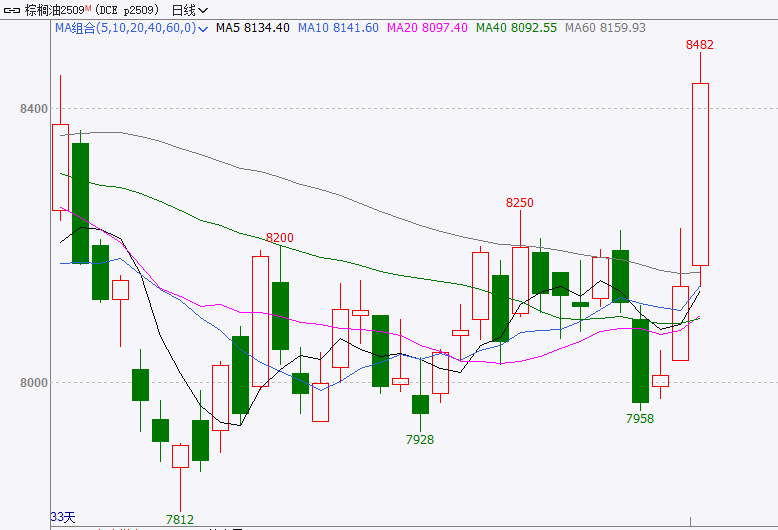 今日大连棕榈油期货价格出现较大幅度上涨,截至收盘主力P2509合约报8436元/吨,日上涨306元/吨,涨幅3.76%。