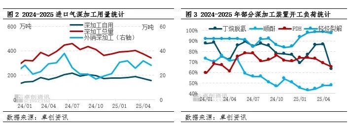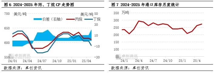 根据卓创资讯数据统计,2025年5月多数深加工装置开工负荷呈现下降趋势,其中丁烷脱氢装置降负明显,主力装置PDH的开工负荷也有下降,直接导致深加工需求缩减明显。月内深加工需求减少18.78万吨,环比下降9.21%。
