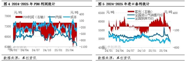 从国内前期套利来看,5月份进口销售与深加工套利均呈现收窄趋势,其中PDH装置亏损幅度负向加深136元/吨,进口销售套利下降267元/吨。由于5月前期受关税政策影响,美国货物难以进入中国,中东货物水涨船高,到岸价格不断攀升,进口贸易商采购成本不断增加,但由于丙烯市场表现欠佳,国内液化气市场受供需面影响也呈现下调趋势,5月份进口深加工以及外销套利情况均不乐观,也进一步牵制贸易商采购情绪,导致到港量下滑。
