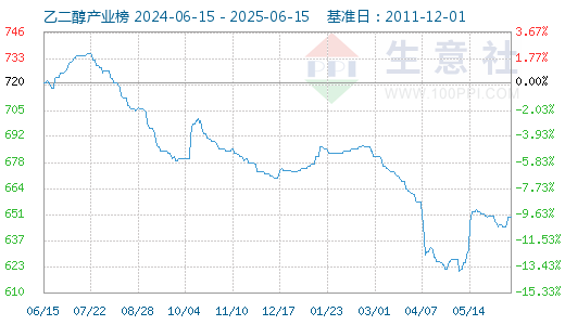 6月16日乙二醇产业指数为652点,较昨日上升了3点,较周期内最高点1115点(2018-09-10)下降了41.52%,较2020年04月02日最低点525点上涨了24.19%。(注:周期指2011-12-01至今)