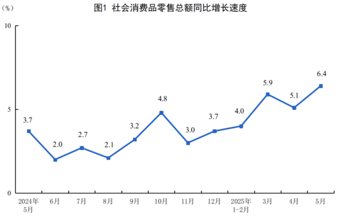 6月16日国家统计局公布多项月度数据。5月社会消费品零售总额41326亿元,同比增长6.4%,增速创2023年12月以来新高。在今年“贸易摩擦”升温的背景下,消费的表现相对好于投资。“以旧换新”等政策支持起到了至关重要的作用,并与“618”提前开启形成合力,共同带动5月社零同比进一步扩张。其中,基本生活类和部分升级类商品销售增势较好,限额以上单位粮油食品类、金银珠宝类、体育娱乐用品类商品零售额分别增长14.6%、21.8%、28.3%;限额以上单位家用电器和音像器材类、通讯器材类、文化办公用品类、家具类商品零售额分别增长53.0%、33.0%、30.5%、25.6%。