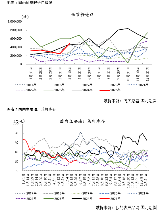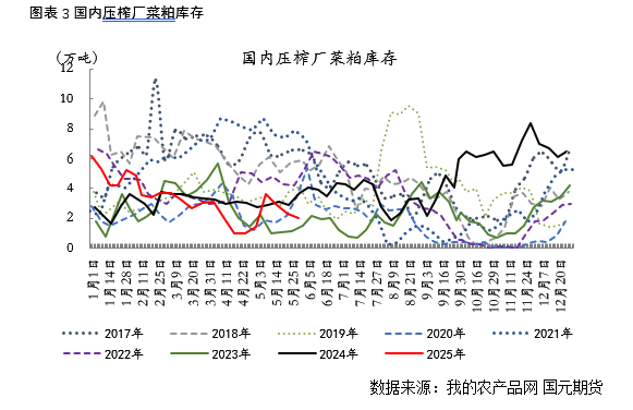 国产菜籽来看,2025年国产菜籽产量预计达到1150万吨,同比增产8.8%,叠加端午节后南方主产区集中上市,短期内市场供给将显著增加。