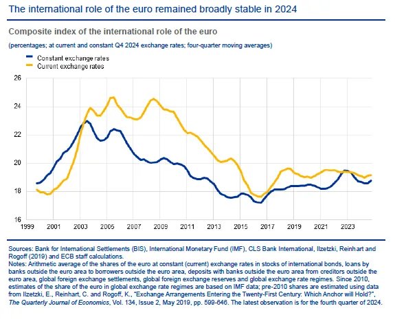 市场动态为这一战略构想提供了现实依据。今年以来,特朗普时期反复无常的贸易政策持续发酵,导致国际资本加速撤离美元资产。与此同时,欧洲特别是德国扩大财政支出的政策转向,正吸引全球投资者重新审视欧元资产配置价值。但欧洲央行最新研究报告显示,2024年欧元在国际支付、储备货币等关键领域的市场份额仍维持原有水平,凸显其与美元竞争的艰巨性。拉加德坦言:"欧元国际化进程不会自然天成,必须通过持续努力争取。当前对主导货币的信任危机尚未转化为实质性替代需求,反而更多体现在黄金避险需求上升。"