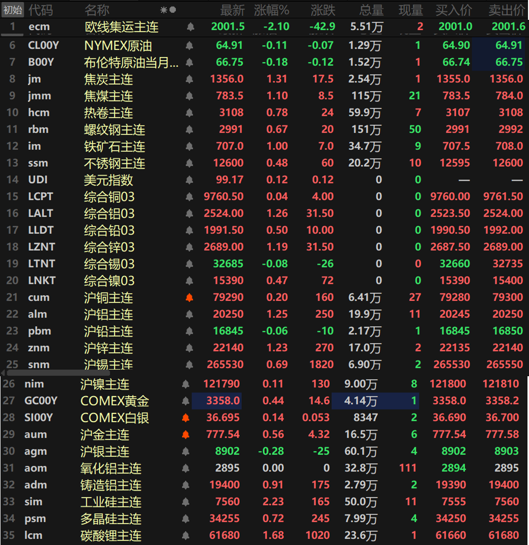 此外,碳酸锂主连涨1.68%,多晶硅涨0.72%,工业硅涨2.23%。欧线集运主连跌2.1%。