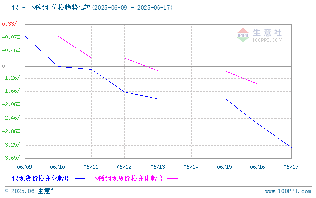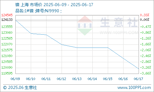 据生意社商品行情分析系统监测,6月17日,现货电解镍报120008元/吨,周跌幅3.32%,同比下跌13.15%。菲律宾政策松动加剧供应过剩预期vs.印尼实际供应瓶颈与成本支撑,多空因素交织下镍价承压震荡。