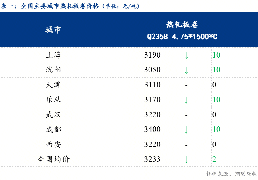 今日热轧板卷全国主要城市价格小幅下跌,截止发稿时3.0mm热轧板卷全国均价3290元/吨,较上一交易日下跌3元/吨;4.75mm热轧板卷全国均价3233元/吨,较上一交易日下跌2元/吨。分区域来看,今日各区域基本持稳或小幅下行,下跌幅度在0-10元/吨左右。今日黑色商品期货弱势运行,10合约收涨0.13%,期货市场弱势震荡运行,部分市场早盘现货价格基本持稳,午后盘面继续弱势,部分市场午后继续下调报价,市场成交情况较弱,部分市场下调报价,全日成交情况一般。