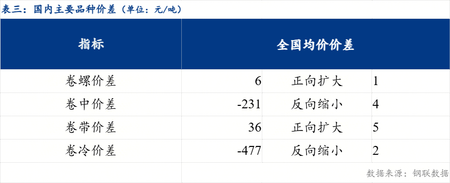 从品种价差来看,卷螺差较上一交易日正向扩大1元/吨,热中价差较上一交易日反向缩小4元/吨,热带价差较上一交易日正向扩大5元/吨,热冷价差较上一交易日反向缩小2元/吨。